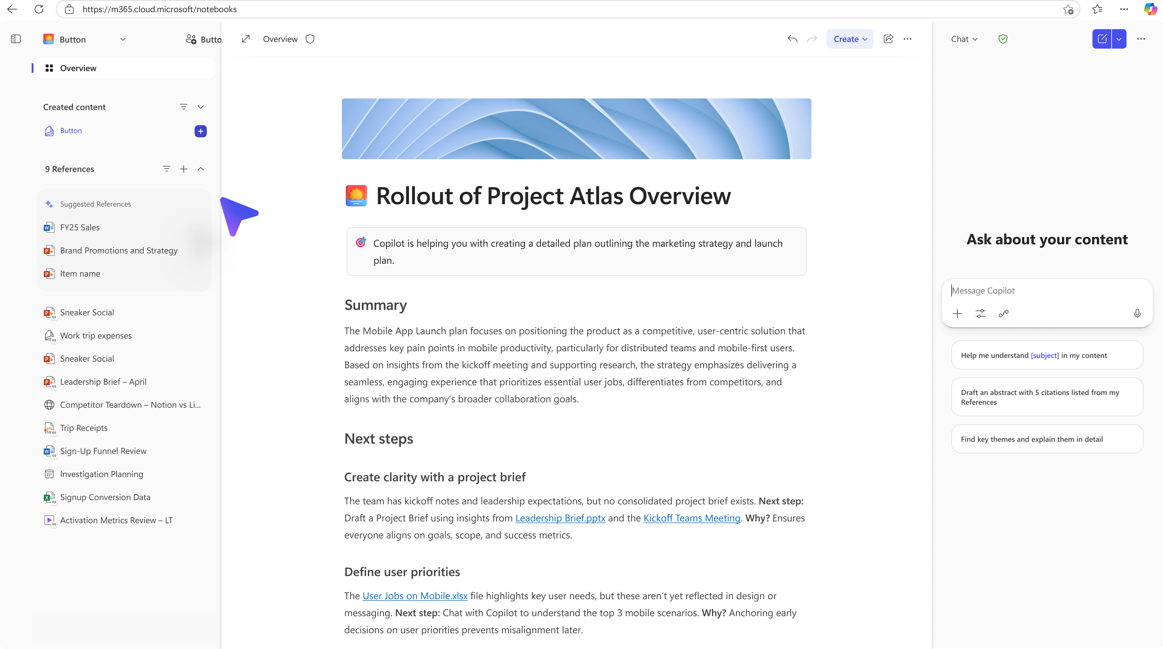 Users can gather all their project materials in one place, and Copilot will ground its insights, updates, and suggestions in that unified content.